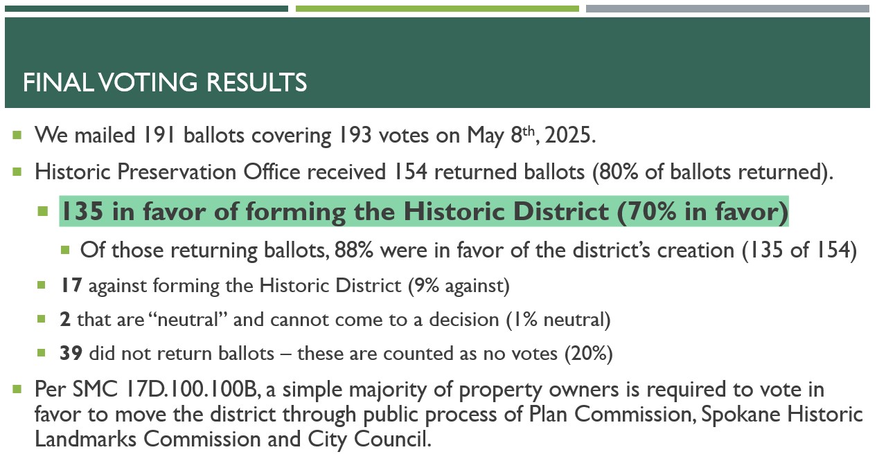 Hearing was held by the Spokane Historic Landmarks Commission on 8/2/2025 – vote to recommend to City Council passed 9-0.